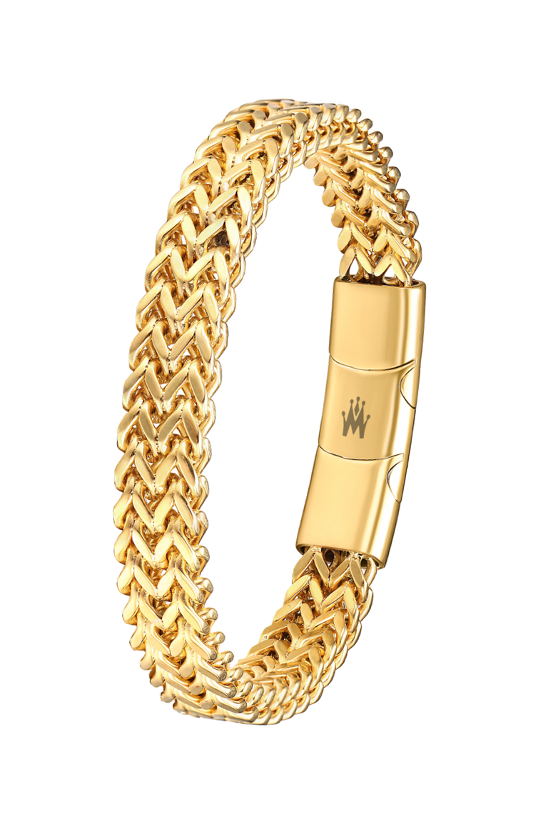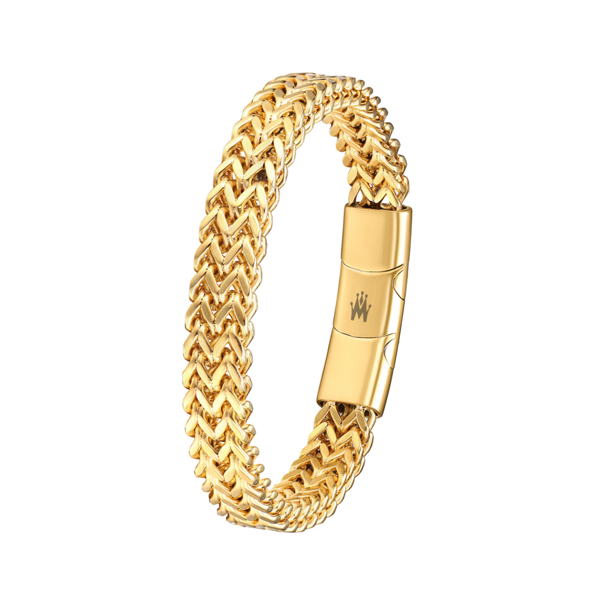 Armband, Edelstahl 316L-PVD gold antiallergisch geflochten poliert, Breite 9.5mm, Magnetverschluss mit Verlängerunsglied 21-22.5cm