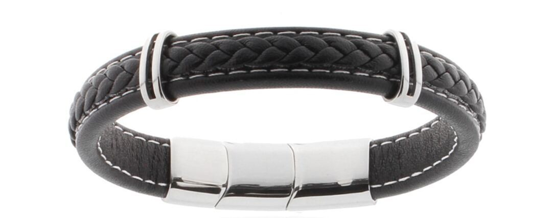 Lederarmband geflochten mit Edelstahleinlagen poliert in PVD-schwarz, Breite 12mm, Grösse verstellbar 21-22.5cm