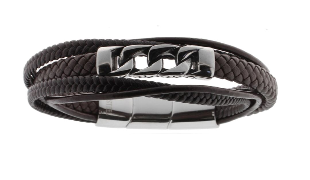 Lederarmband braun geflochten mit Edelstahleinlagen poliert in PVD gun, Breite 13mm, Grösse verstellbar 21-22.5cm