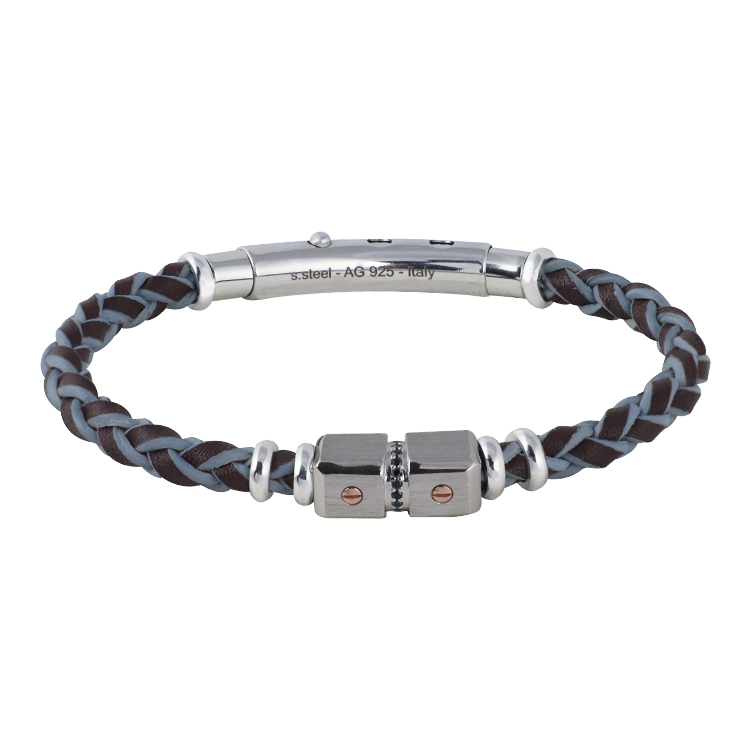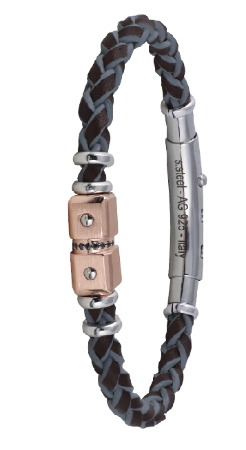 Armband, Silber 925‱ rhodiniert-PVD rosa, Leder geflochten blau-schwarz, Breite 6/7mm, Breite 6mm, Gleitverschluss, verstellbar 20.5-21.5cm, Made in Italy