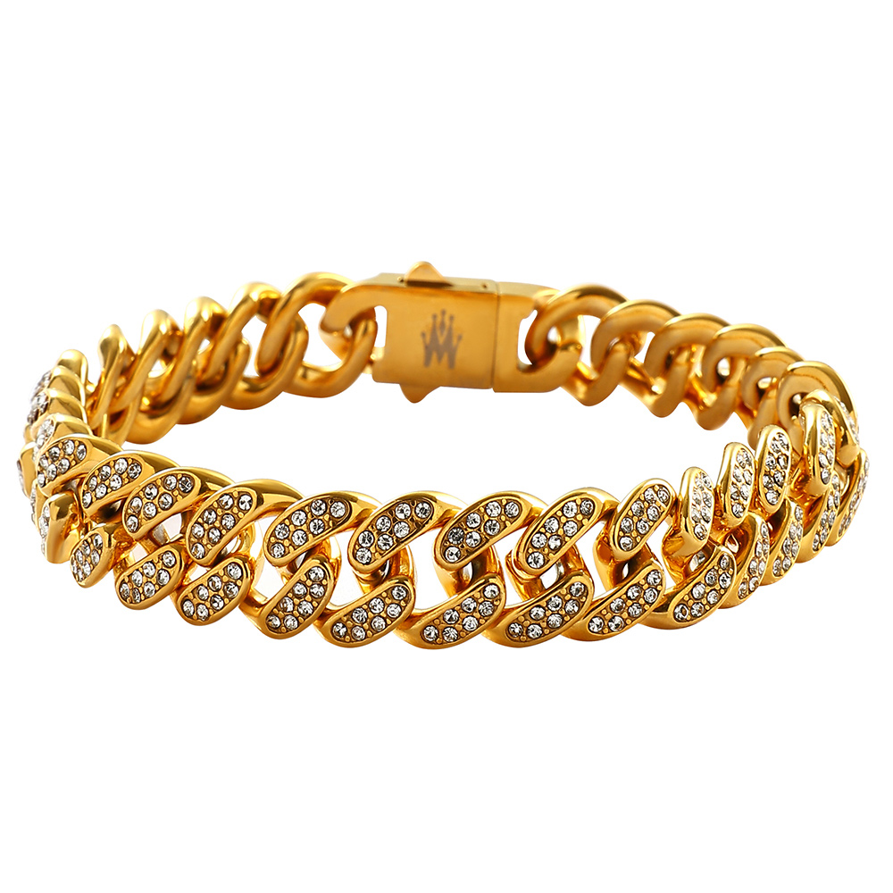 Cuban Link Armband aus Edelstahl 316L-PVD gold antiallergisch, 458 Zirkoniasteine Breite 12mm, Laschenverschluss, Länge 21cm.