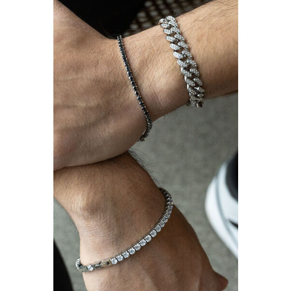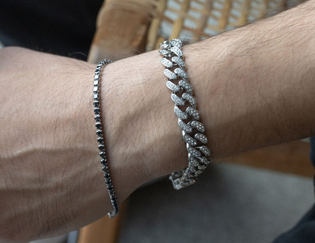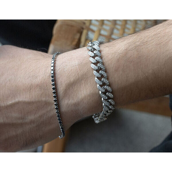 Cuban Link Armband aus Edelstahl 316L antiallergisch, 207 Zirkonia Steine (triple A Qualtiät) Ø 1.5mm, gefassst mit Mikrocasting, Breite 12mm, Laschenverschluss, Länge 21cm.