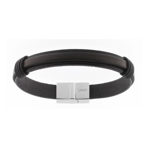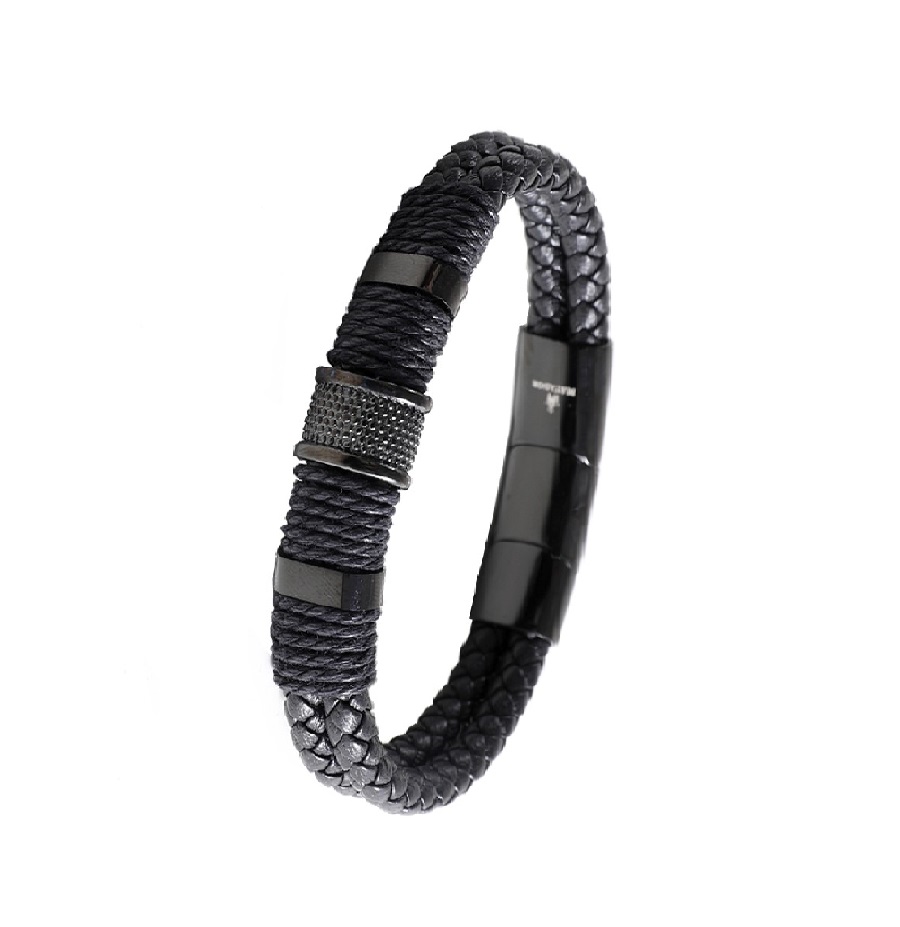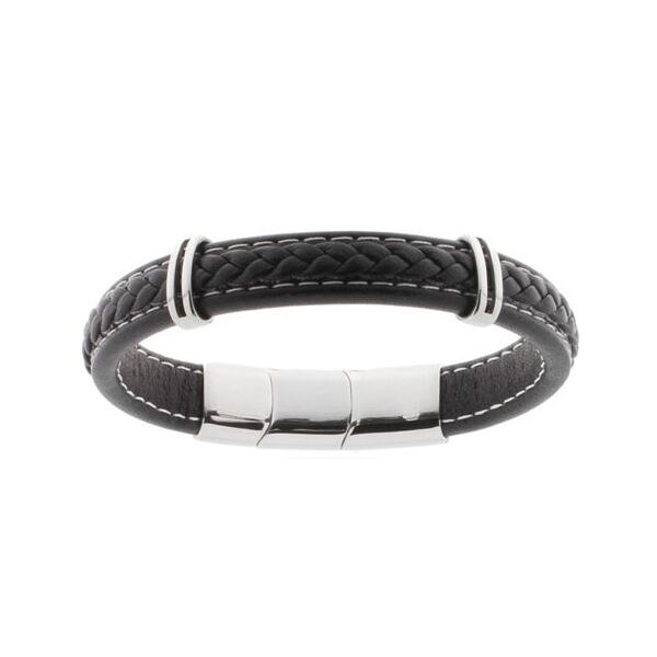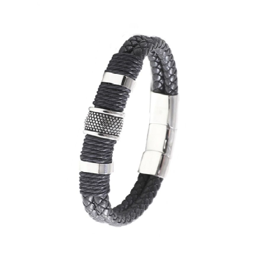 Bracelet en cuir noir tressé avec inserts en acier inox. poli, (Italian Leather) largeur 12mm, taille réglable 21-23cm