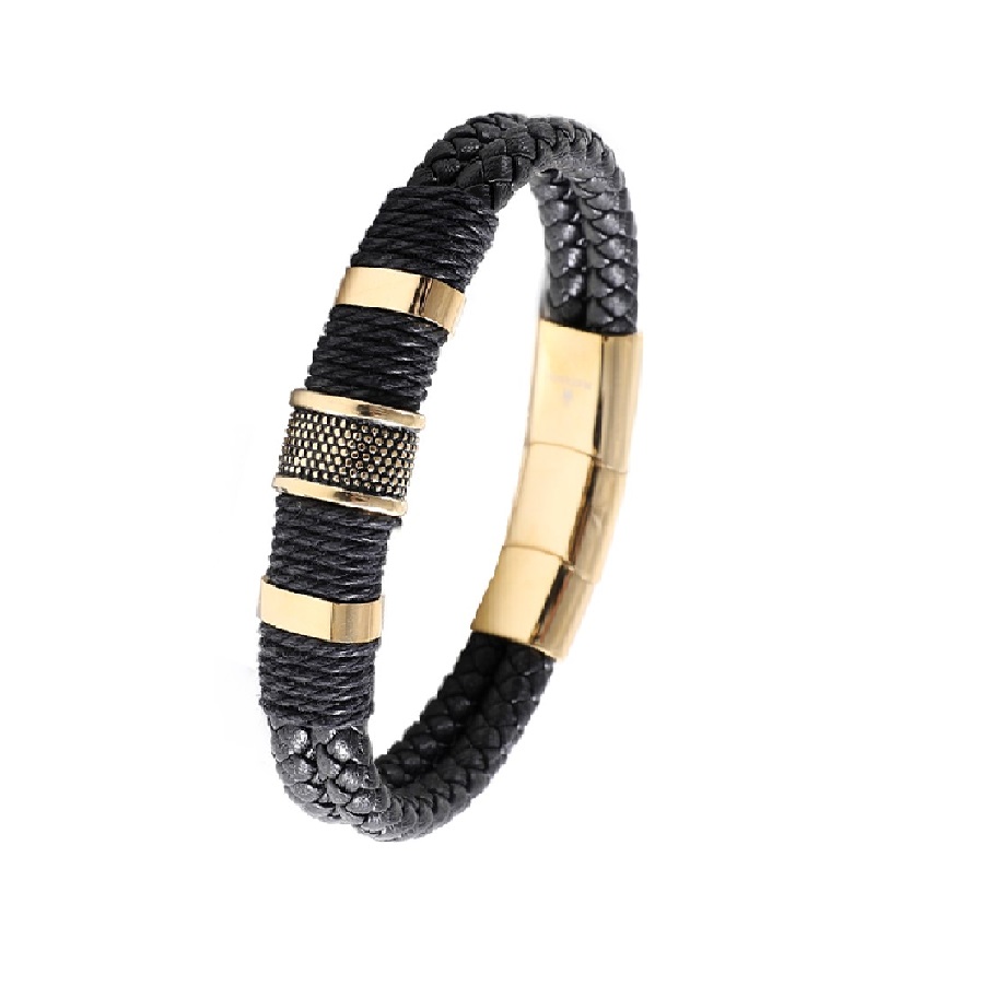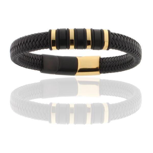 Bracelet en cuir tressé avec inserts en acier inox. poli en PVD-or jaune, largeur 12mm, taille réglable 21.5-22.5cm