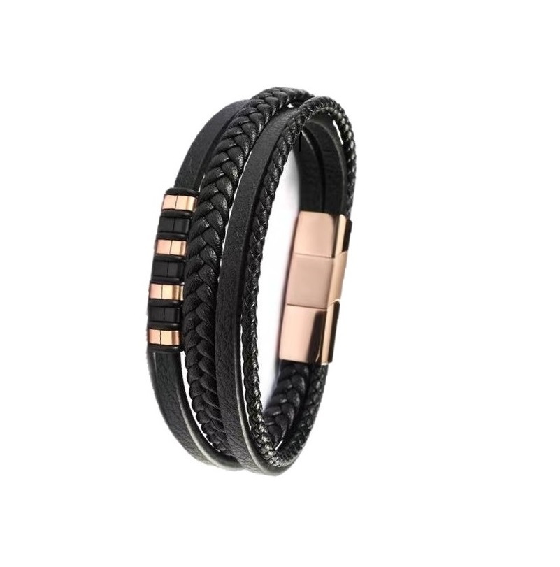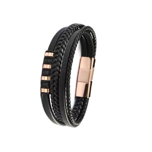Bracelet en cuir tressé avec inserts en acier inox. poli en PVD-or rose, largeur 12mm, taille réglable 21.5-22.5cm