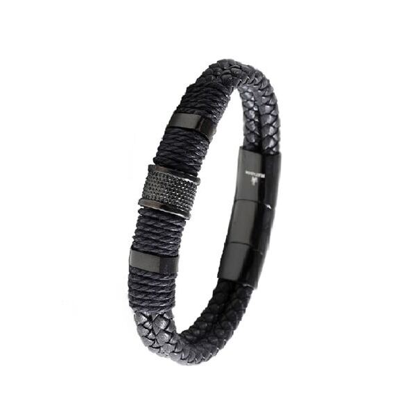 Bracelet en cuir tressé avec inserts en acier inox. poli en PVD-noir, largeur 12mm, taille réglable 21.5-22.5cm