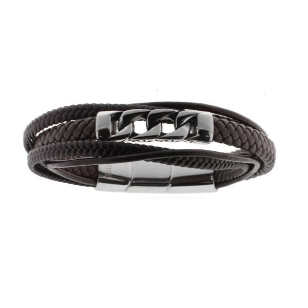 Bracelet en cuir tressé avec inserts en acier inox. poli, largeur 12mm, taille réglable 21.5-22.5cm
